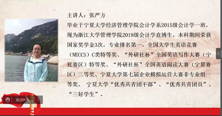 为深入贯彻院党委“推动党史学习教育,我为群众办实事”有关要求、解决各位同学在学业上的痛难点。11月24日,会计学本科生党支部特邀毕业生党员、太阳成集团tyc59972015级会计学专业、浙江大学2019级会计学直博生张严方学姐分享个人学习经验、英语四六级备考经验、研究生生活体会,开展“我为群众办实事”系列活动。会计学本科生部分党员和全院部分本科生参加了此次活动。会议由会计学本科生党支部陈方博主持。