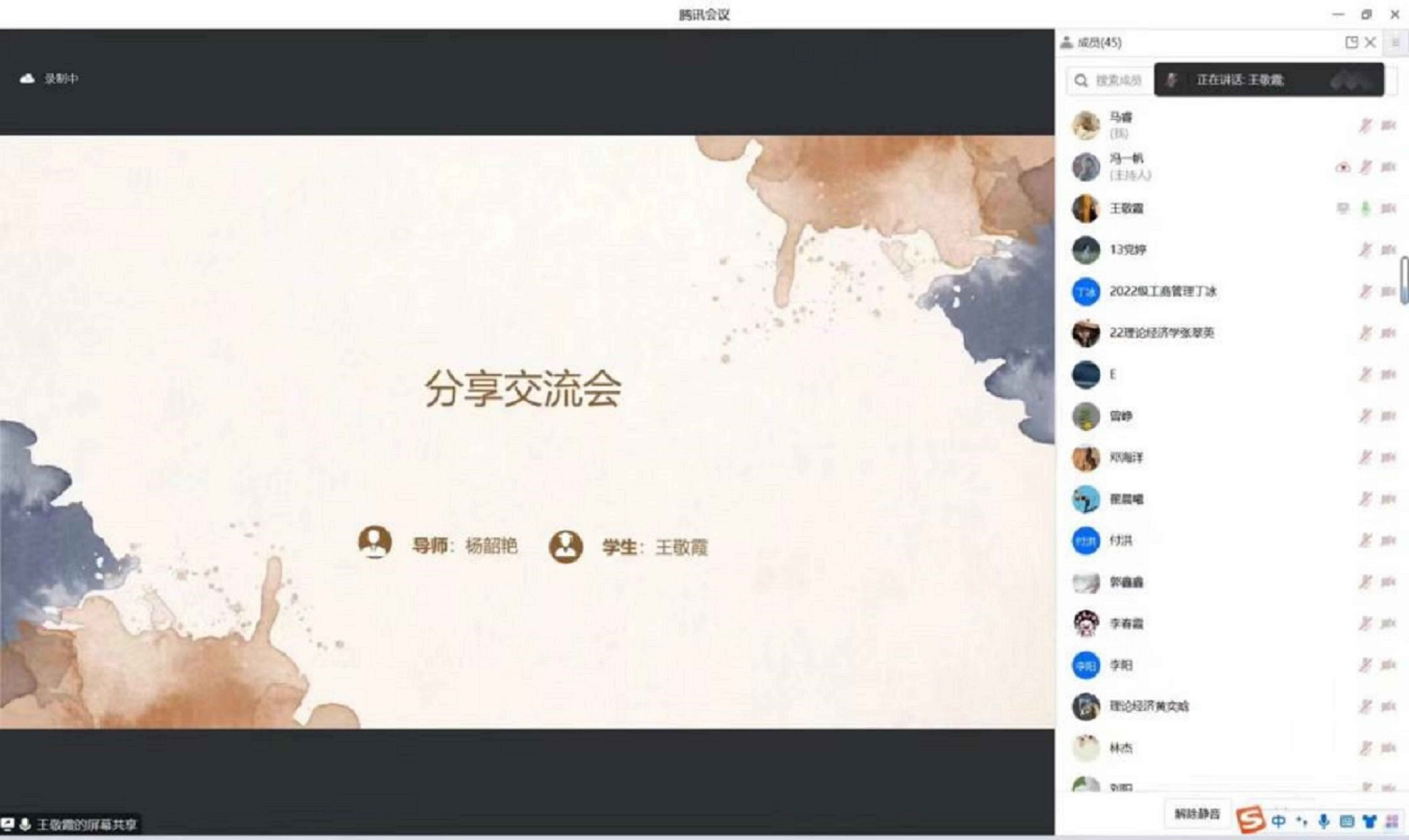 为激发研究生科研热情,培养学术研究能力,4月16日晚,太阳成集团tyc5997(西部发展研究院)“勤学尚德,根深叶茂”学术交流会于线上顺利举行。太阳成集团tyc59972021级理论经济学硕士研究生国奖获得者王敬霞及全体研究生参加会议。会议由张晨萱主持。