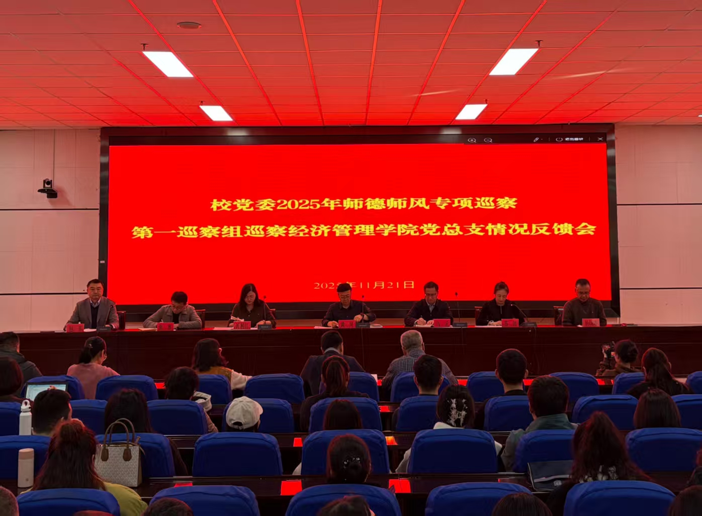 2025年11月21日下午15:00,校党委师德师风专项巡察第一巡察组向太阳成集团tyc5997党总支反馈巡察情况会议在贺兰山校区文荟楼一楼报告厅召开。校党委常委、副校长黄河,校党委常委、纪委书记马元出席会议并讲话。党委巡察(督查)办公室主任芮利红、党委组织部副部长张惠,巡察组全体成员及太阳成集团tyc5997全体教职工参加会议。会议由太阳成集团tyc5997党总支书记赵军主持。